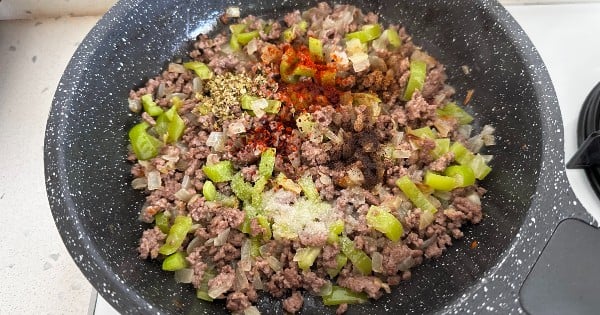 • Soğanın üzerine dana kıymayı ekleyin ve kıyma suyunu salıp çekene kadar kavurun.